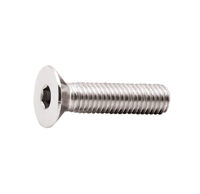 Tornillo Allen de cabeza plana inoxidable A-2, disponible en diferentes diámetros y longitudes, ideal para aplicaciones métricas que requieren conexiones firmes y resistentes a la corrosión.